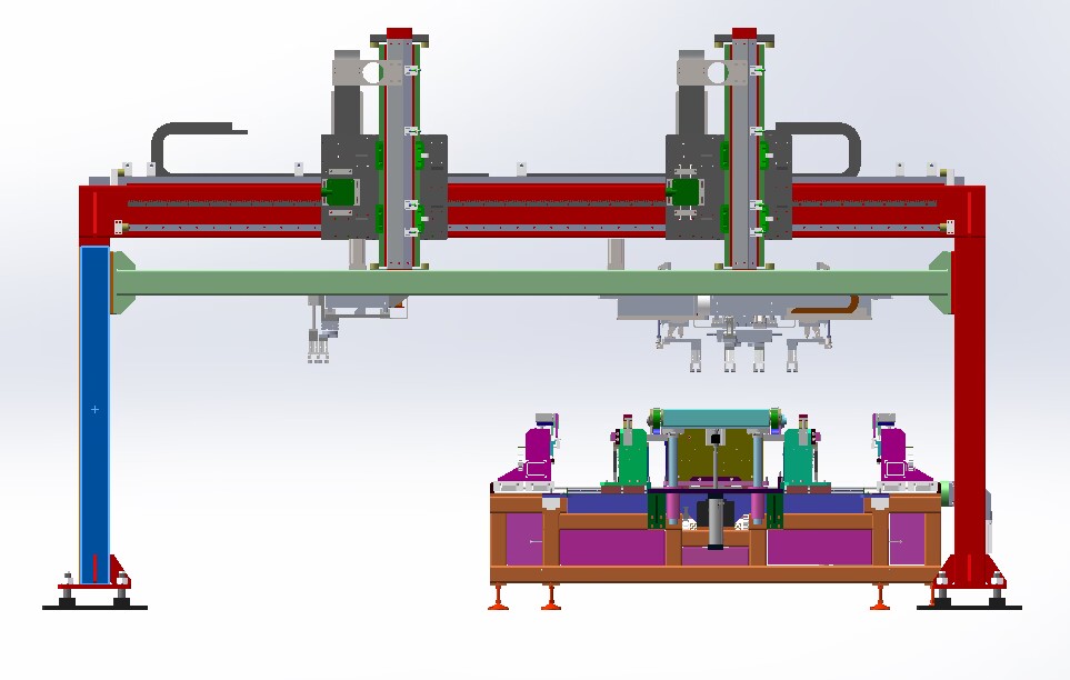 自動(dòng)排版機(jī)的主要功能單元有:玻璃輸送定位系統(tǒng)、抓取行走系統(tǒng)、視覺檢測系統(tǒng)、電控系統(tǒng)等;通過以上功能單元,實(shí)現(xiàn)了將自動(dòng)串焊機(jī)串焊好的電池串,按照工藝尺寸要求和排版方向順序自動(dòng)排版鋪設(shè)到玻璃(EVA已經(jīng)鋪設(shè))上,組成電池串陣列。玻璃/EVA通過傳輸線傳輸至指定位置,機(jī)械手抓取電池串實(shí)現(xiàn)CCD定位、自動(dòng)旋轉(zhuǎn)、自動(dòng)排版功能。設(shè)備通過同步帶傳輸與自動(dòng)生產(chǎn)線對接,實(shí)現(xiàn)了自動(dòng)流水作業(yè)。